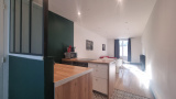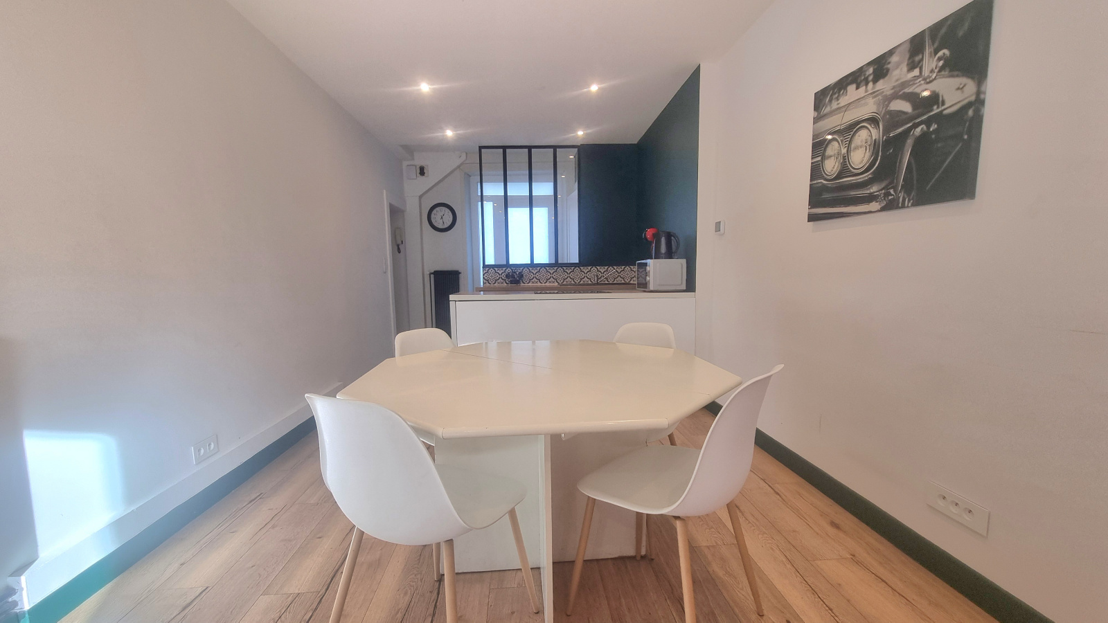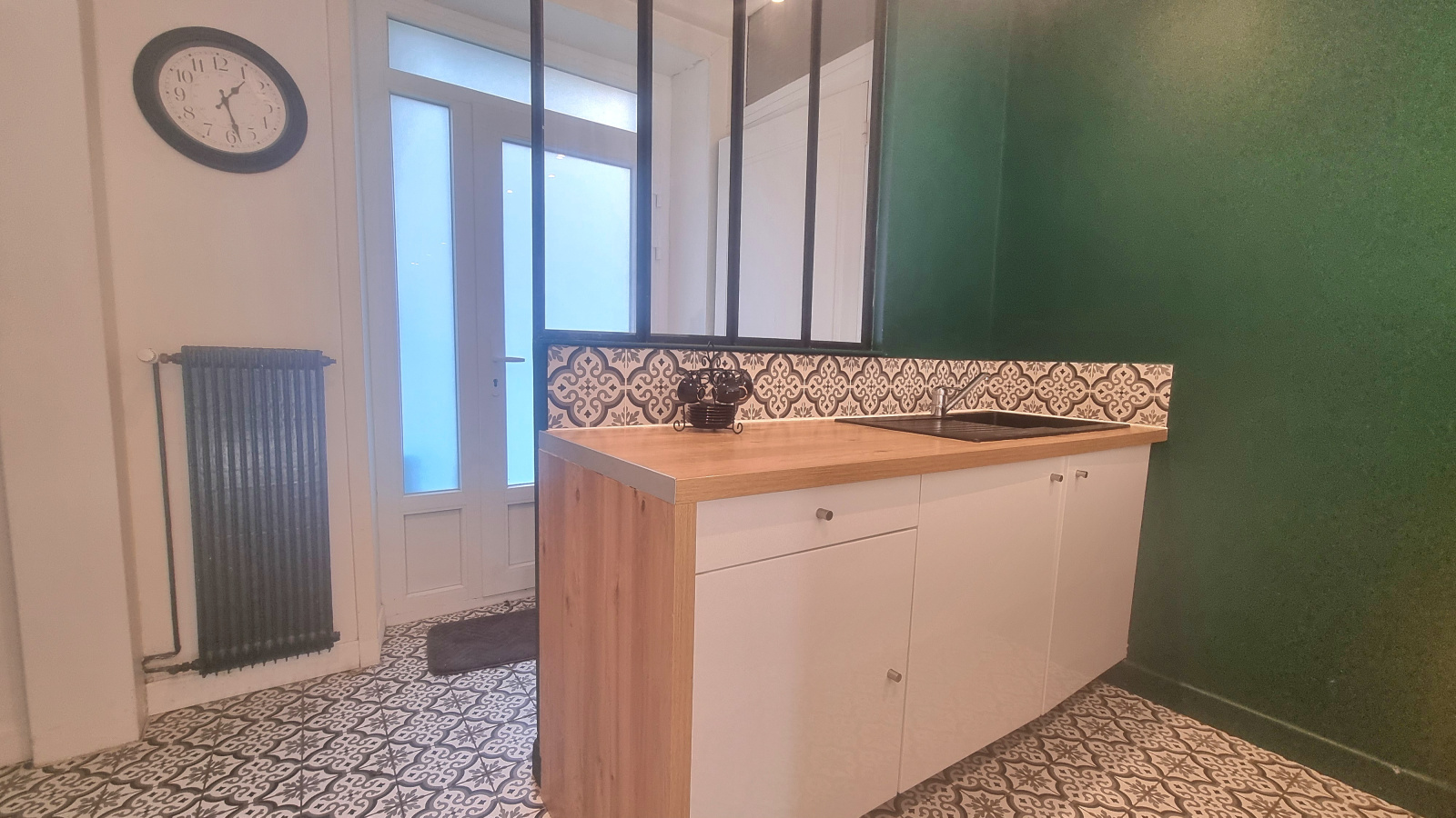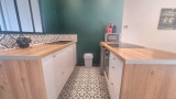 Juste à côté, la cuisine aménagée et équipée, au design résolument moderne, vous invite à la créativité culinaire. Tout y est : four, micro-ondes, plaque de cuisson, et réfrigérateur.