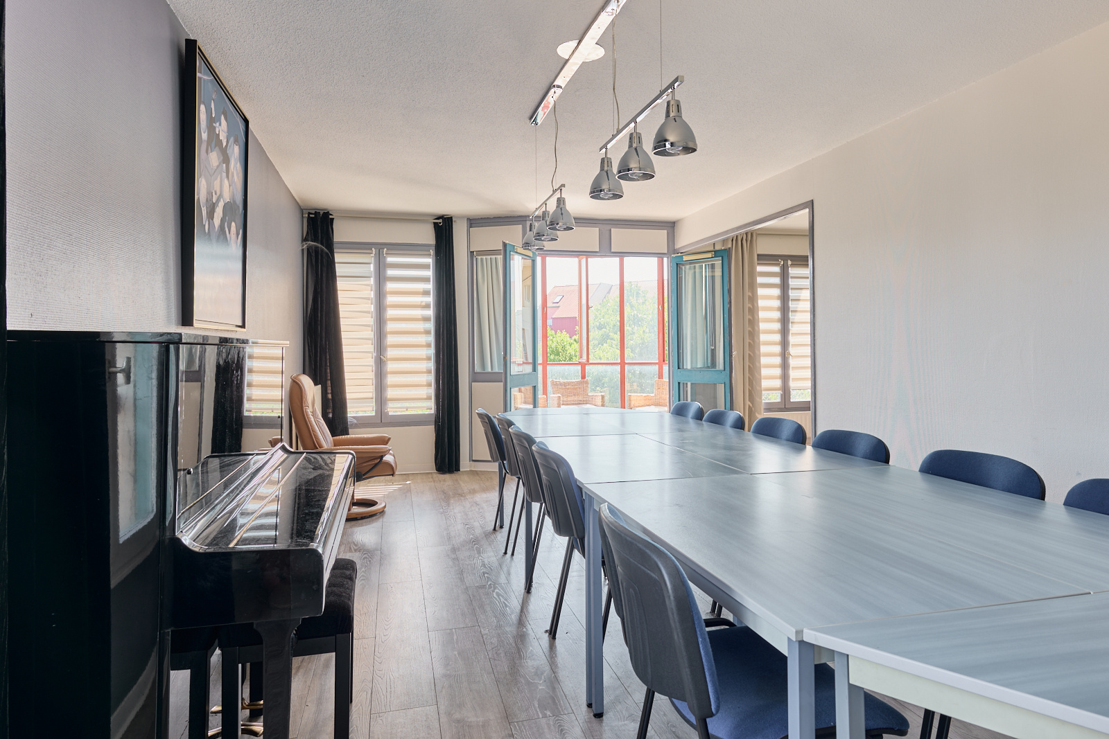 Dans le prolongement, le salon lumineux vous offre un véritable espace de détente. Grâce à son bow-window, la lumière naturelle entre généreusement et la vue dégagée apporte une vraie sensation d’espace et de sérénité. C'est l'endroit idéal pour se blottir avec un livre, rire aux éclats avec ses proches, ou simplement profiter du silence.