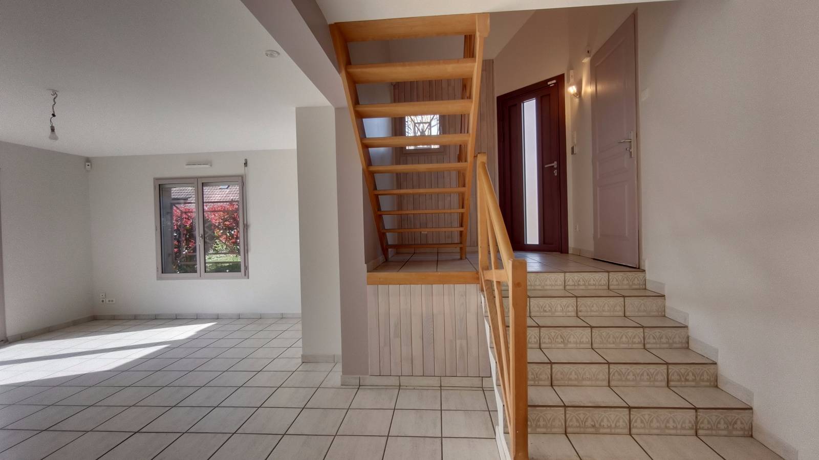 L'escalier mène à un palier en mezzanine, créant un superbe effet de verticalité et une circulation fluide entre les niveaux. Cet espace surplombe l'entrée, renforçant cette sensation de volume et de modernité.