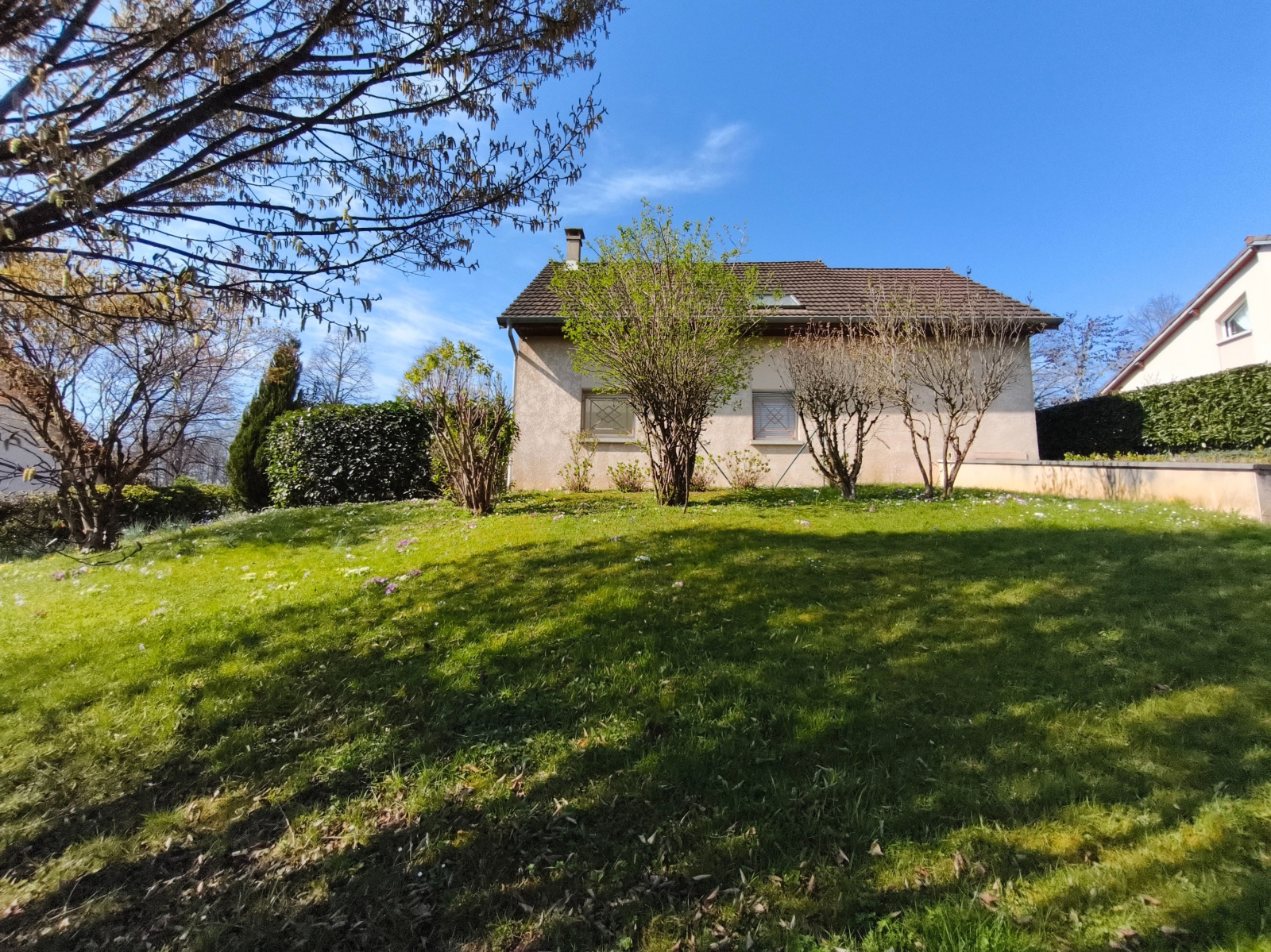 À l'extérieur, vous profitez d'un terrain arboré, offrant un bel écran de verdure. La maison dispose également d'un garage attenant pour votre véhicule et d'une cave, idéale pour le stockage.