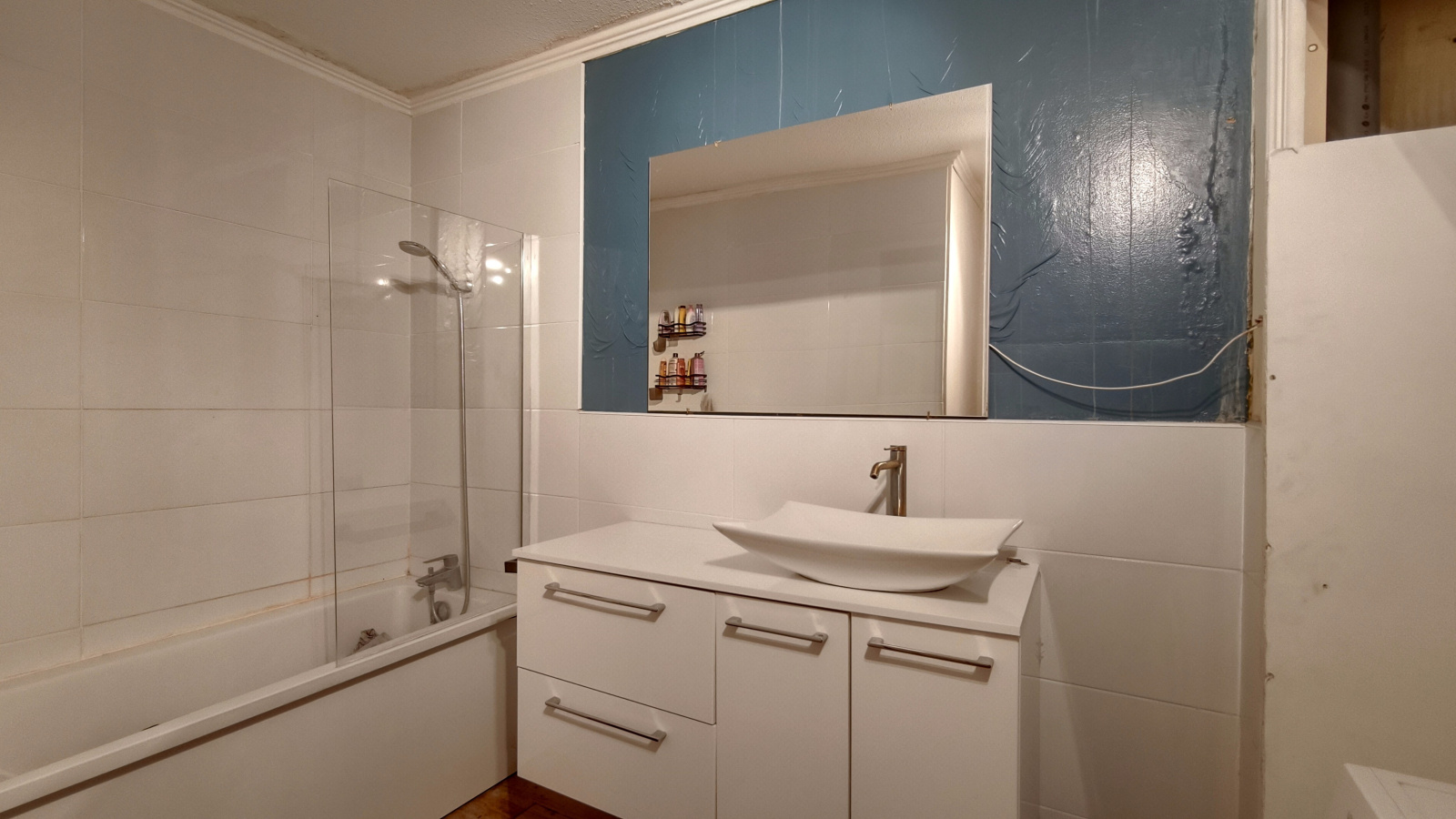 La salle de bain, fonctionnelle dispose d'une baignoire, d'un meuble vasque contemporain et d'un espace dédié pour votre machine à laver. WC séparé. La salle de bain est en cours de rénovation.